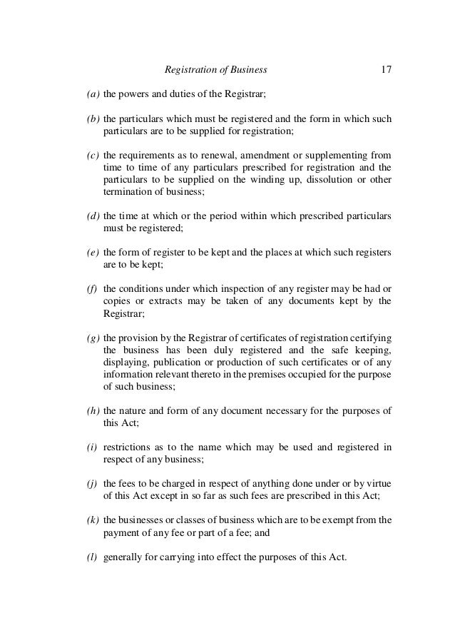 Registration of Business Act 1956 from image.slidesharecdn.com Short title and application 1. A business that is specified in the schedule of the registration of businesses act 1956 (act 197) (roba 1956) and registration of businesses rules 1957 is a type of sole proprietorship and partnership business. 2499 (1956) before the date of the entry into force of the business registration act (no. (1) this act may be cited as the registration of businesses act 1956. A company has distinct name and limited liability, it is a juristic person having a separate legal entity different from its members who constitute it, capable of rights and duties of its own and endowed with a potential or perpetual succession. (1) this act may be cited as the registration of businesses act 1956. Registration of businesses act 1956. An act to provide for the registration of businesses.