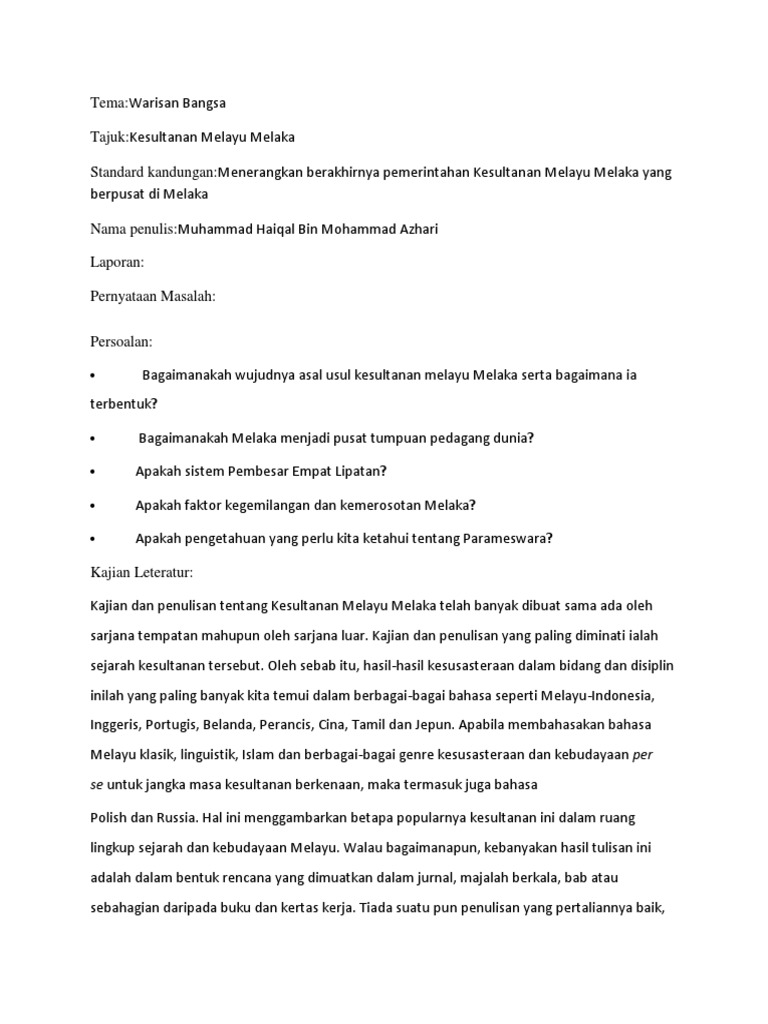 Doc Kesultanan Melayu Melaka Muhammad Zarrin Academia Edu from 0.academia-photos.com Kali ini kisah yang ingin diceritakan adalah berkenaan sejarah asal usul orang kalur sebagai pemain nobat diraja. Mereka meganggap melaka sebagai mulaqah iaitu yang bermaksud 'pertemuan'. Mereka menganggap melaka sebagai mulaqah iaitu yang bermaksud 'pertemuan'. Video animasi pendek pengasasan kesultanan melayu melaka. Mengikut sejarah melayu, parameswara yang telah membuka negeri melaka. Tanah melayu ialah semenanjung, bukan pulau, jadi ia bukan sebahagian daripada kepulauan melayu atau malaysia. Pengasas kesultanan melayu melaka ialah parameswara pada sekitar tahun 1400. Bab 9 :warisan kesultanan melayu sistem pemerintahan dan pentadbiran sistem perundangan warisan kesultanan melaka kegiatan ekonomi sosiobudaya.